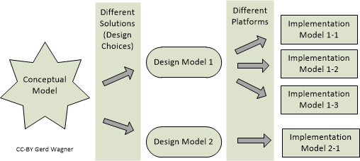 In the design phase, a platform-independent solution design model is developed on the basis of the domain model, consisting of an information design model and a process design model. The same domain model can potentially be used to produce a number of (even radically) different design models. Then, one or more platform-specific implementation models can be derived from a design model. These one-to-many relationships between conceptual models, design models and implementation models are illustrated in Figure 1.1.