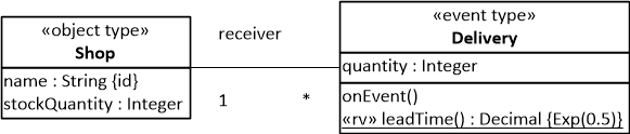 Notice that we have modeled the random duration of a service with the help of the random variable operation serviceDuration() shown in the third compartment of the ServiceDesk class. It must be implemented by a method that samples the exponential distribution function Exp(0.5).